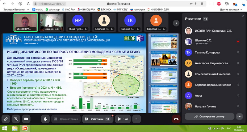 В рамках работы Секции «Рождаемость: исследования как основа разработки механизмов позитивного воздействия» принял участие и выступил с докладом кандидат технических наук, доцент, ведущий научный сотрудник ИСЭПН ФНИСЦ РАН Крошилин Сергей Викторович на тему «Ориентация молодежи на рождение детей: позитивная тенденция или препятствие для самореализации». На секции «Вклад государственных программ и национальных проектов в здоровьесбережение нации» был сделан доклад доктором экономических наук, доцентом, главным научным сотрудником ИСЭПН ФНИСЦ РАН Медведевой Еленой Ильиничной на тему «Достижимость ключевых социо-демографических показателей, отраженных в национальных проектах».