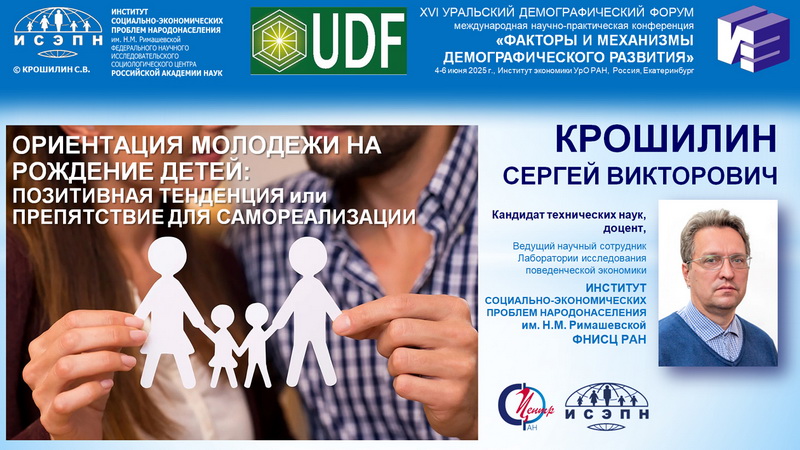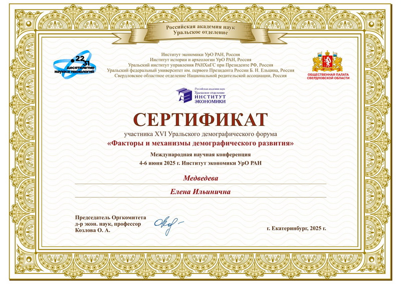 С 4 по 6 июня 2025 г. в Институте экономики УрО РАН состоялся XVI Уральский демографический форум «Факторы и механизмы демографического развития». Цель форума – укрепление научного сотрудничества, обмен опытом и результатами научных достижений российских и зарубежных ученых в области демографии и смежных дисциплин для совершенствования стратегий научных исследований и выработки практических рекомендаций по вопросам демографического развития.